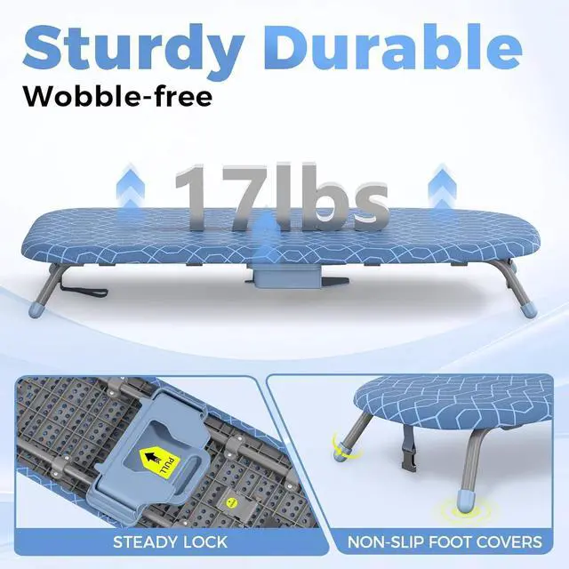 SMOOTH SURFACE &STURDY MATERIAL- The cloth cover is flat and smooth without any grooves, you can easily iron your clothes on it. Adjustable TRP feet covers help shield floors from scratches and easy to use on uneven table top. In addition, it can breathe and dissipate heat quickly with the help of mesh design