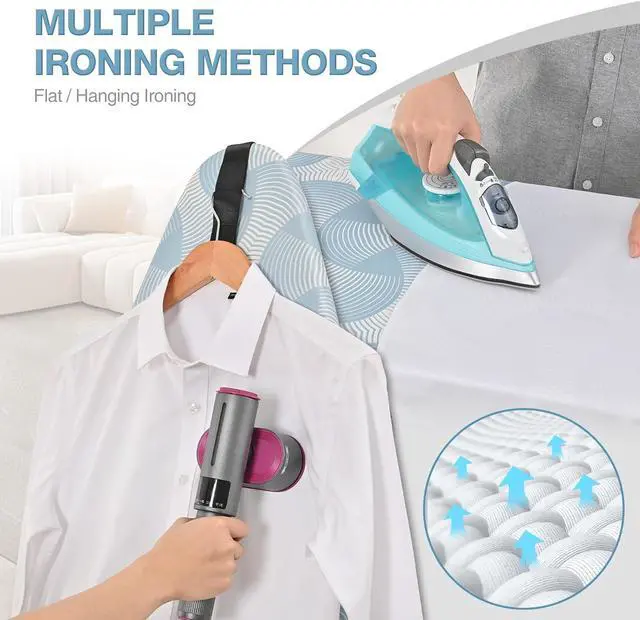 Dual-Position Adjustable Strap Use as a traditional horizontal ironing board or flip vertically for steaming hanging garments. The adjustable elastic strap secures clothing in place, ensuring wrinkle-free results on shirts, dresses, curtains, and more