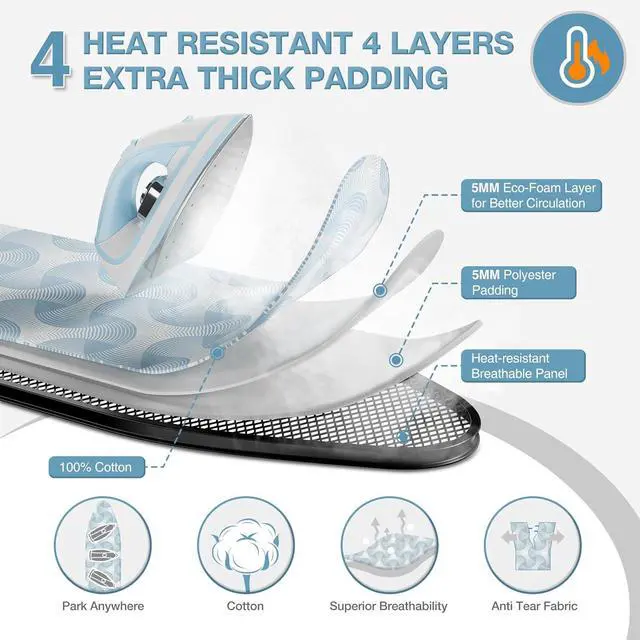 Premium 4-Layer Ironing Pad Combines pure cotton, 5mm foam cushion, 5mm polyester padding, and breathable panel for superior fabric protection and smooth gliding