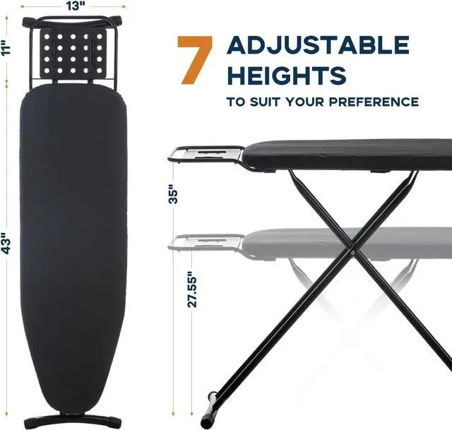Ironing Board Full Size: RAINHOL Height-Adjustable iron board measures 54.33 x 13.38 x ( 27.55 -35) in when unfolded, 55.11 x 14.56 x 2.7 in when packaged; Premium quality metal frame with ironing bracket has a total weight of 12 lbs