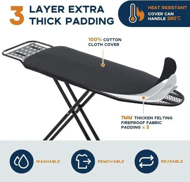 Heat-resistant Cover: The ironing board cover is a 100% cotton cloth cover; It' s removable, washable, and reusable, and it comes with two layers of 7 mm thick pads made of fireproof fabric; The extra thick cloth cover ensures you an extraordinary ironing experience
