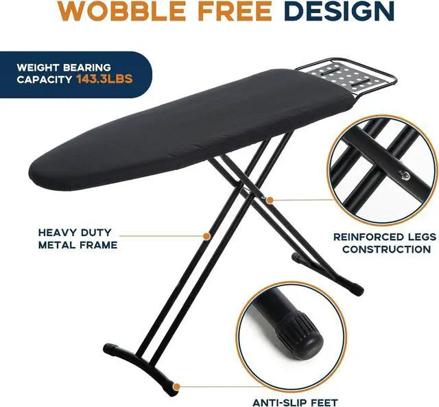 Iron Rest: The ironing stand comes with a robust iron rest area on the side to hold your iron securely while in use; The steel legs are sturdy and durable with non-slip silicone caps