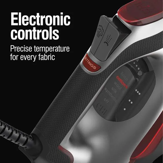 DIGITAL CONTROL DIAL WITH FABRIC GUIDE. Choose your fabric type using the illuminated control, and the iron sets the temperature accordingly, eliminating the guesswork.
