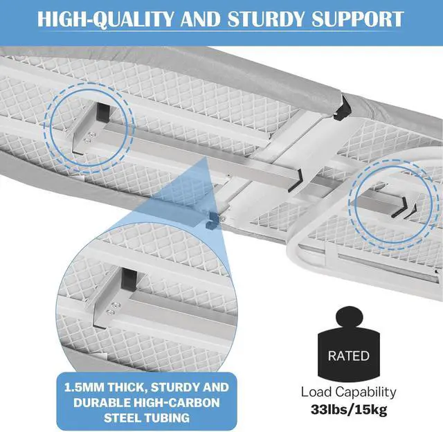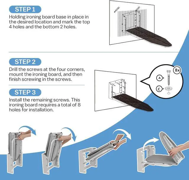 New Upgrade Height Adjustment: The wall mounted ironing board with 3 levels of height adjustment, with intervals of 4 inches, you can choose the most suitable height according to your preference.
