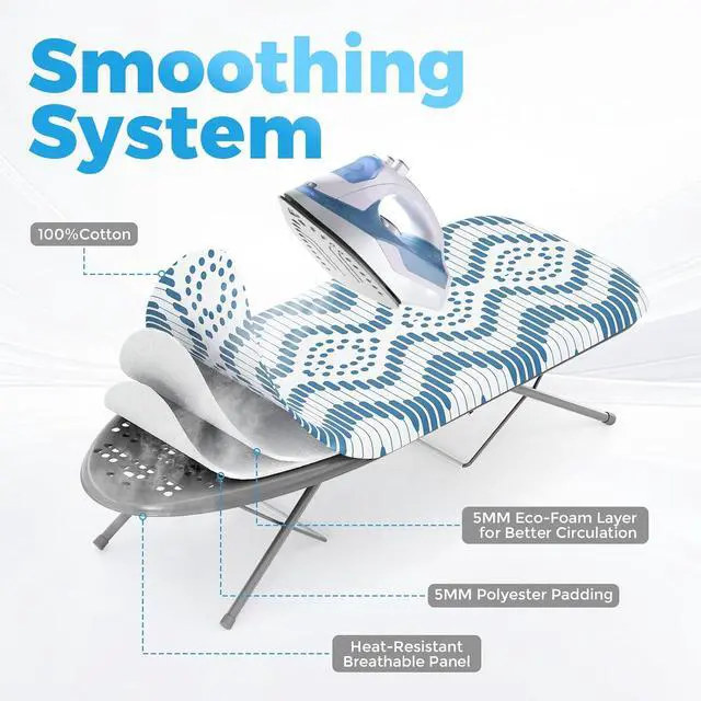 Heat-Resistant Cover: Our tabletop ironing board with padded felt underlay and 100% cotton cover, effectively preventing being damaged due to high temperature during ironing, ensuring long-term and stable use. Flat and smooth cloth cover without any grooves for wrinkle-free clothing, is great ideal for suit, dress, collared shirt or other any garment