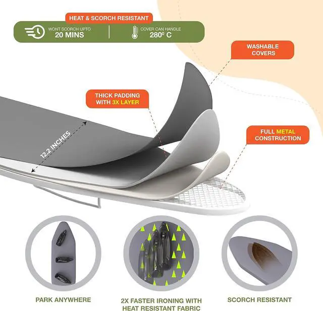 STEAM / ELECTRIC IRON FRIENDLY: Professional machined perforated steel tabletop allows steam to escape faster aiding wrinkle removal and a sturdy ironing surface. The cotton ironing board cover and pad is non reactive to iron your expensive clothes reducing damage due to pigment transfer