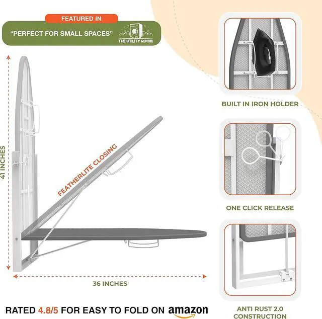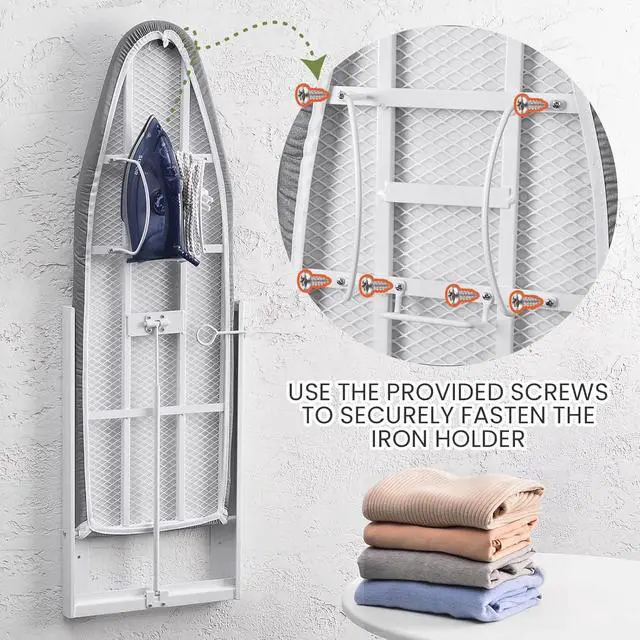 EASY INSTALLATION (4 BOLTS): The folding ironing station can be easily installed with just 4 bolts (included) fixing the holder together with the wall or in a cabinet. It is structurally rigid with one click release hinges and does not take more that 20 minutes to install.