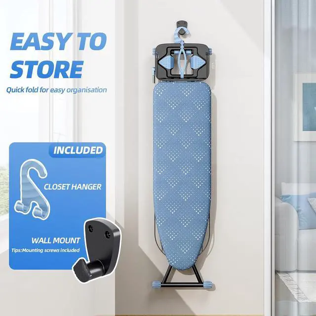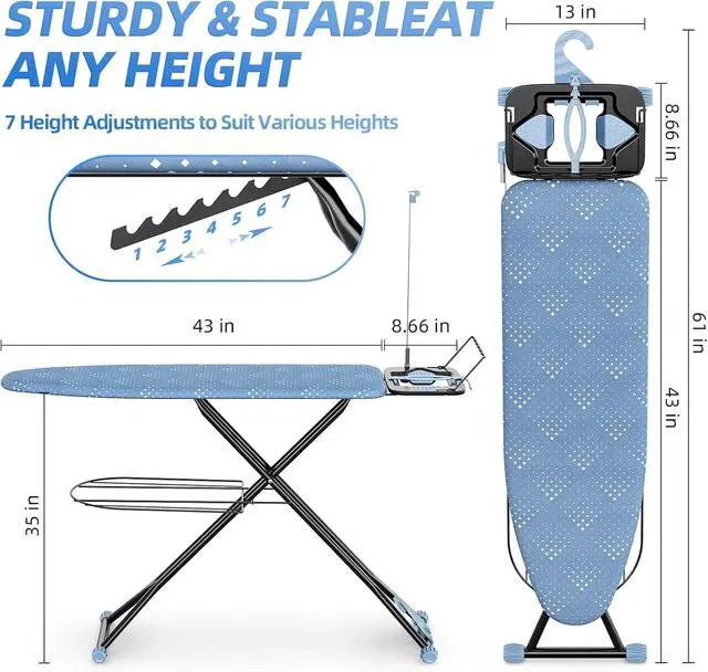 Adjustable & Space Saving: Our ironing board with 7 height settings, ranging from 27 inches to 35 inches to ensure a perfect fit for your height, and the safety latch design prevents accidental opening or closing. The iron stand foldable, hook design allows for easy hanging without taking up too much indoor space