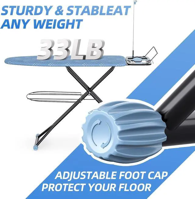 Sturdy & Durable Structure: Built with heavy-duty components, our ironing board showcases an unyielding and long-lasting design. The thickened metal legs and adjustable foot cap, supports and this ironing table remains stable and wobble-free during use. There has a garment rack at the bottom for storing clothes