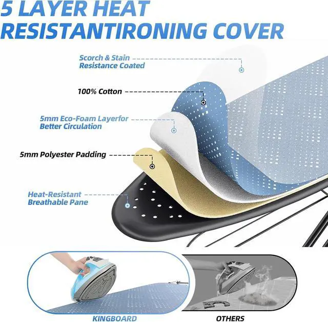 Heat-Resistant 3-Layer Cover: This ironing board cover with 5mm needle-punch cotton, 5mm sponge padding and heat-resistant fabric effectively preventing being damaged due to high temperature during ironing, ensuring long-term and stable use. Specially treated, the surface of the cloth cover has super wear resistance
