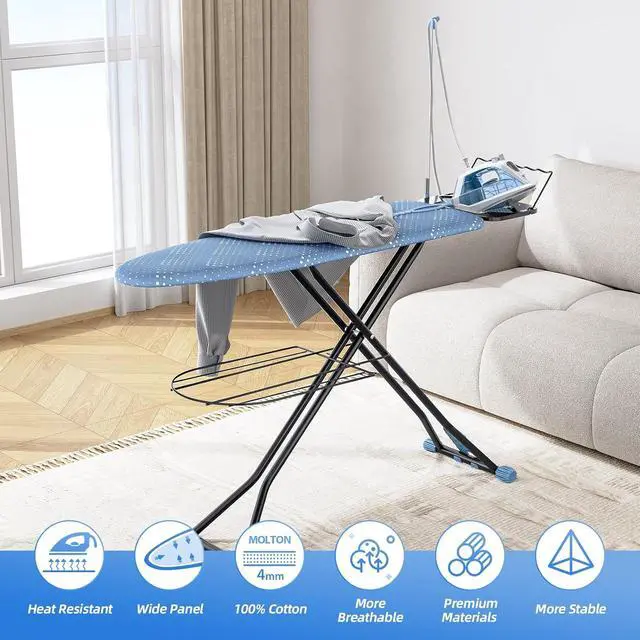 Breathable Panel: KINGBOARD ironing board features a spacious surface with dimensions of 13x43 inch, large enough to lay out various types of clothing, generously sized top allows for efficient and effective ironing, saving you time and effort. Mesh design make ironing stand dissipates heat quickly, allowing you to easily achieve a smooth and flat ironing effect