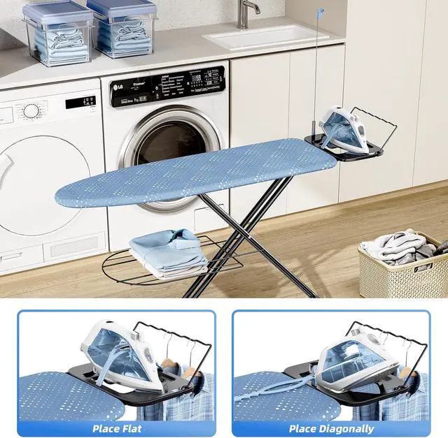 Multifunctional Iron Rest: The ironing board not only has sturdy iron rest but with three-level adjustable silicone irons harness, a flexible iron cord minder and a clothes hanger. Offers options for placing different types of irons. Save time for ironing, making ironing a breeze