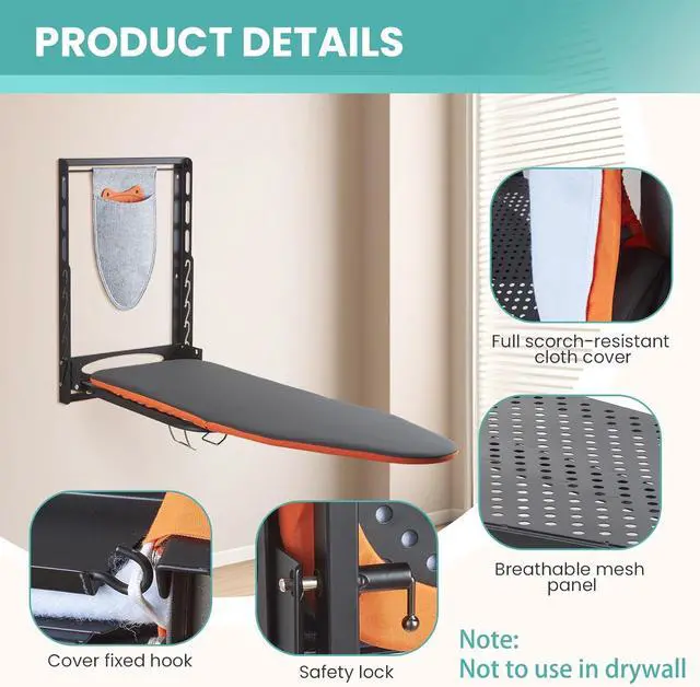 Built-in Iron Holder & Silicone Rest: Comes with a heat-resistant cradle keeps your iron upright. The iron rest mat protects board surface from hot iron. This safety-first design of wall mount ironing board prevents accidental burns and surface damage to wall