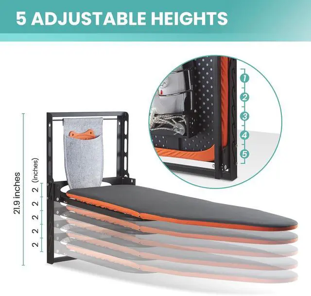 Adjustable Height: The wall ironing board features 5 level of height adjustment, each level is 2 inches. Allowing you to set the height according to your specific needs and space limitations