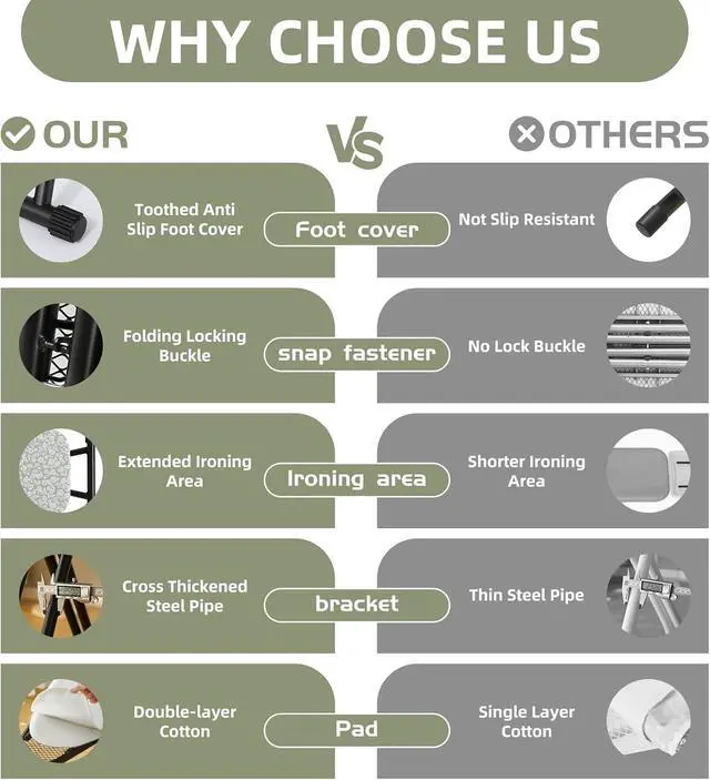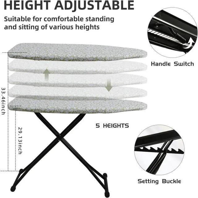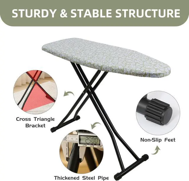 Durable Material Brings Long-lasting Companionship Thickened steel bracket of foldable ironing board is resistant to pressure and rust, with strong load-bearing capacity; Professional grade pure cotton fabric is heat-resistant and scratch resistant, with a humanized design that is detachable and washable, meeting the ironing needs of households or businesses.