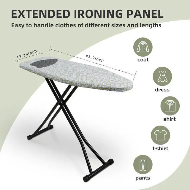 Extended And Thickened Iron Board 13.39 inch * 43.7 inch large ironing area, easy to handle large clothes such as bed sheets, curtains, etc., ironing more efficiently; Thickened steel frame, stable load-bearing, more secure to use.