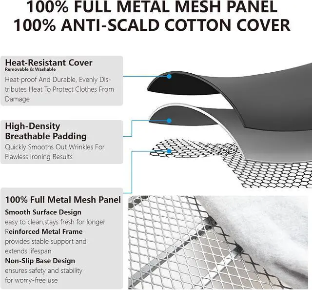 Smooth Ironing, No Heat TrapsThe perforated steel mesh top spreads heat quickly and evenly, while the thick cotton pad protects clothes from shine or damage. Works great with steam or dry irons