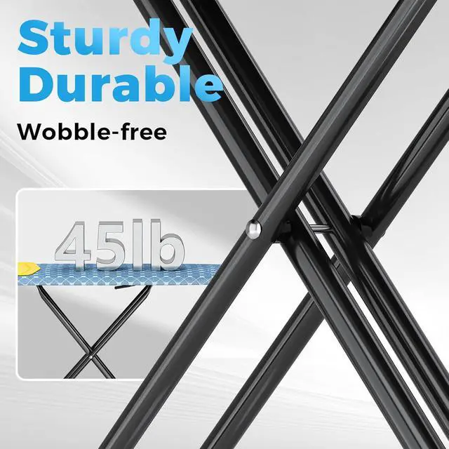 Practical & Exquisite design: Our iron board with heat-resistant silicone iron mat, place the iron smoothly and protects the ironing board surface from the heat of the iron. Constructed with a high-quality metal frame, sturdy leg supports and adjustable foot cap, this ironing table remains stable and wobble-free during use