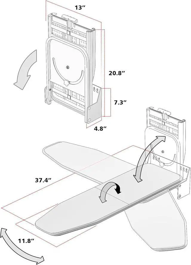 Space Saving DesignNisorpa Ironing Board can be installed on the wall. The size of opened ironing board is L 37.4 " x W 11.8 " x H 7.3 "; When it fold, the size is L13" x W 4.8 " x H 20.8 ". You can just fold it up when you don' t use and keep your home neat