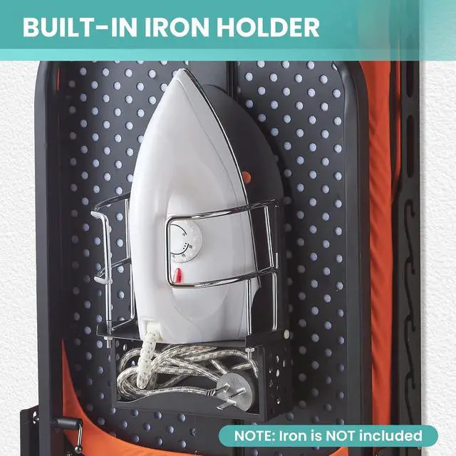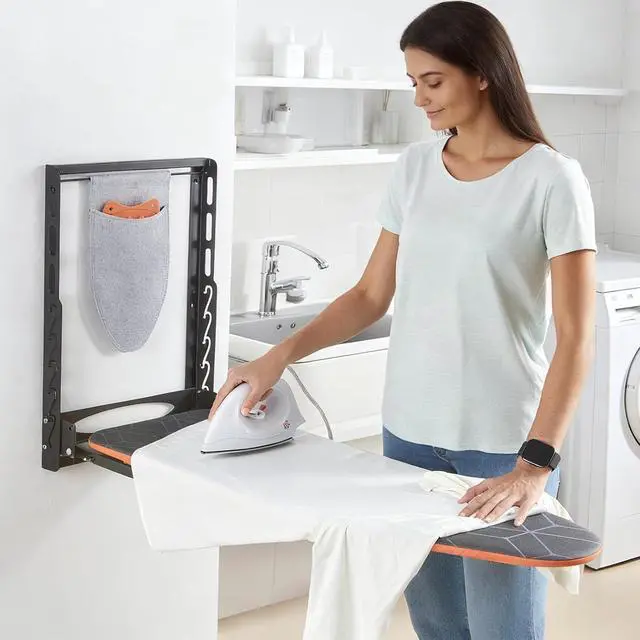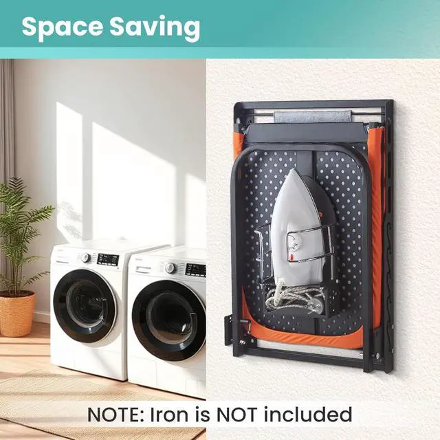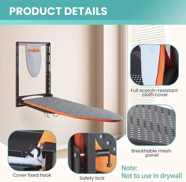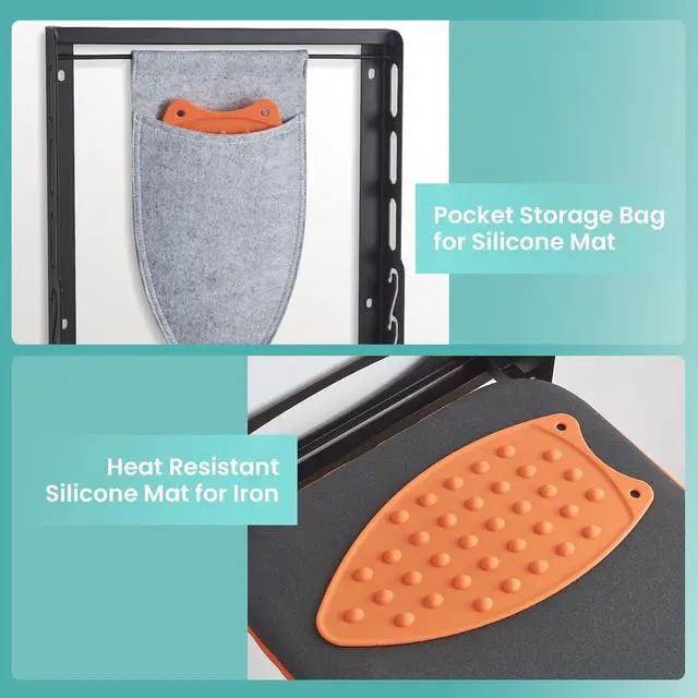 Built-in Iron Holder & Silicone Rest: Comes with a heat-resistant cradle keeps your iron upright. The iron rest mat protects board surface from hot iron. This safety-first design of wall mount ironing board prevents accidental burns and surface damage to wall
