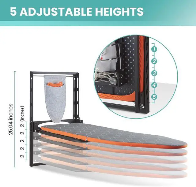 Adjustable Height: The wall ironing board features 5 level of height adjustment, each level is 2 inches. Allowing you to set the height according to your specific needs and space limitations