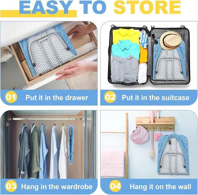 Easy to Store: this lightweight mini Portable Tabletop ironing board can be quickly folded into two halves, And we also have hooks for easy hanging, which is convenient for storage in cabinets, drawers, or can be directly hung in the closet; It is very suitable for narrow spaces, such as wardrobe corners, under the bed or on the wall, and will not take up too much indoor space; When not in use, you can conveniently store it properly to keep your home tidy