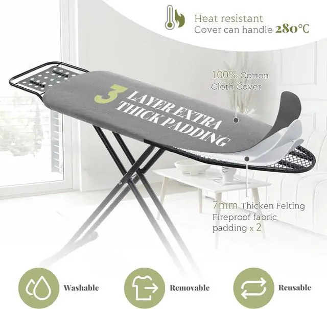 Iron Board Cover with Padding: The ironing board cover is made of 100% cotton; It' s removable, washable, and reusable, and it comes with 2 layers of 7 mm thick pads made of fireproof fabric; The extra thick cloth cover ensures you an extraordinary ironing experience