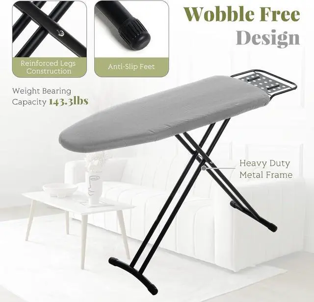 Iron Rest: The ironing stand comes with a robust iron rest area to hold your hot iron securely while in use; The steel T legs construction are sturdy and durable with non-slip silicone caps