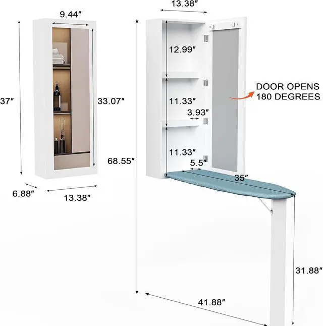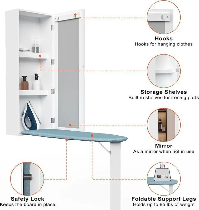 Small Space]: This ironing station is a great combination of full size ironing board, cabinet and mirror. It can be hung on the wall in the laundry, sewing room, bedroom and closet. It adds practical, storage and organization to the home