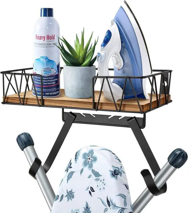 STURDY AND STYLISH: TJ. MOREE ironing board hanger includes a natural wooden element in its functional basket. While ensuring stored items are secure, it creates a rustic yet modern style.