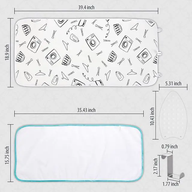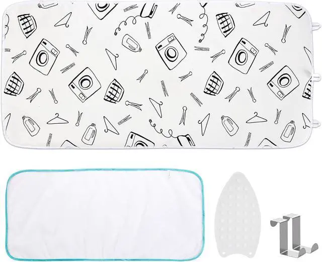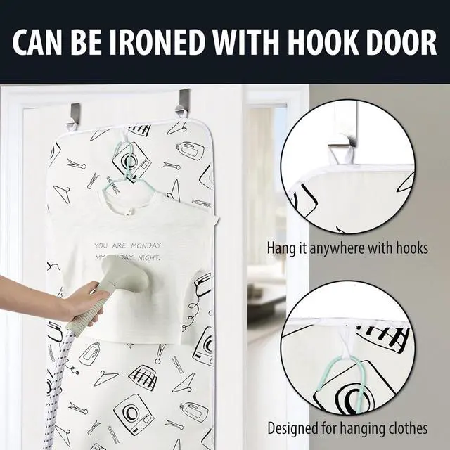 HANGING IRONING DESIGN: There has three hanging holes on this mat, two for hanging on the door or other places. The middle one is for hanging clothes. Can be used as a over the door ironing board. You are not limited on the table top for ironing. This item is good partner for steam iron. Two hooks are included