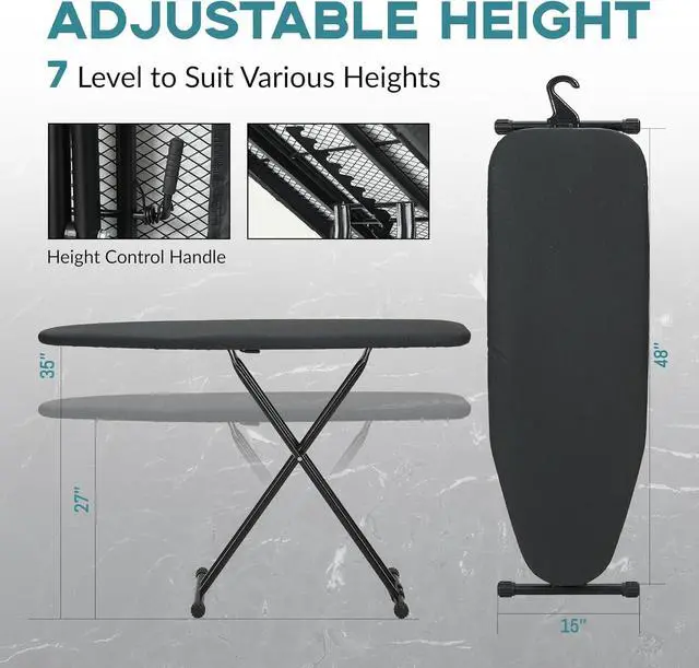Ironing Board Full Size: Our 48" x15" large ironing board is designed for home comfort, with multiple adjustable heights to suit different users, ensuring less strain on your back and a smoother ironing experience thanks to its stable and durable build