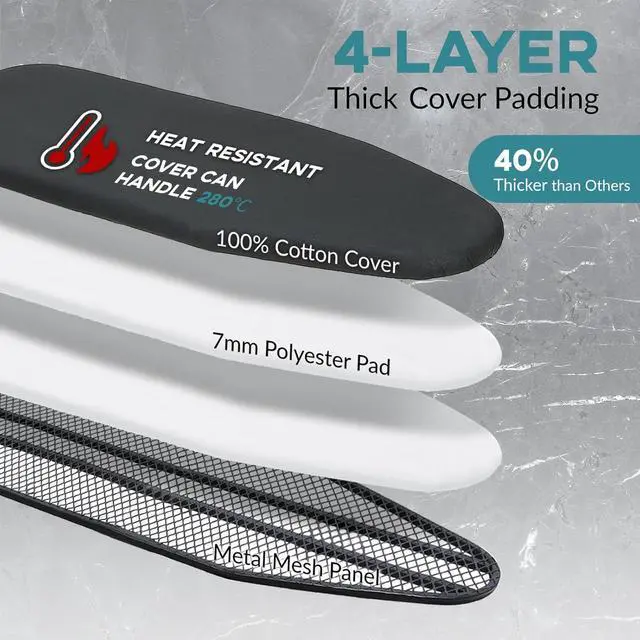 Iron Board Cover: Heat-resistant cotton cover with thick dual-layer padding holds heat effectively, creating a smoother surface so the iron glides with ease and helps you finish ironing faster