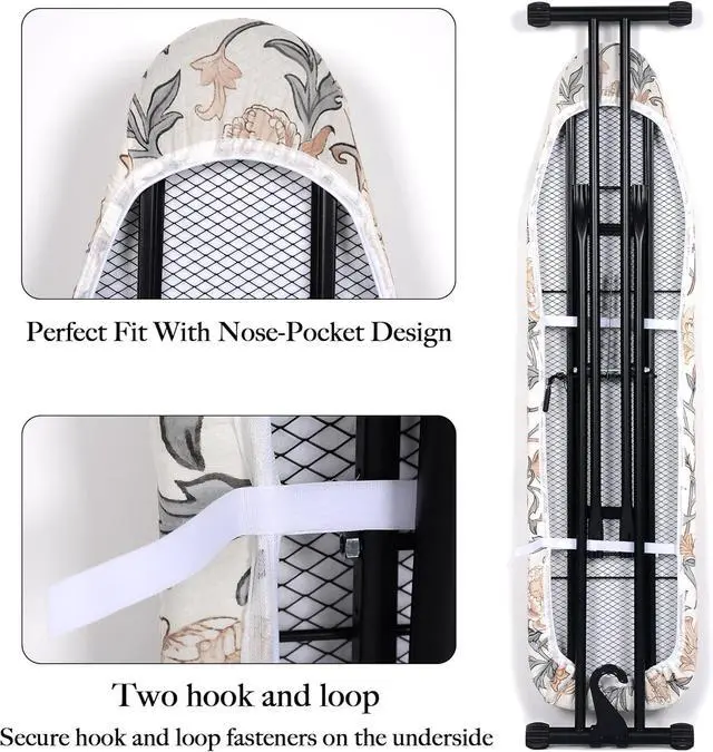 The non-slip design with a premium elastic edge and adjustable hook-and-loop strap allows for easy setup in seconds. The iron board cover with padding stays securely in place, providing a snug fit that wont shift during use.