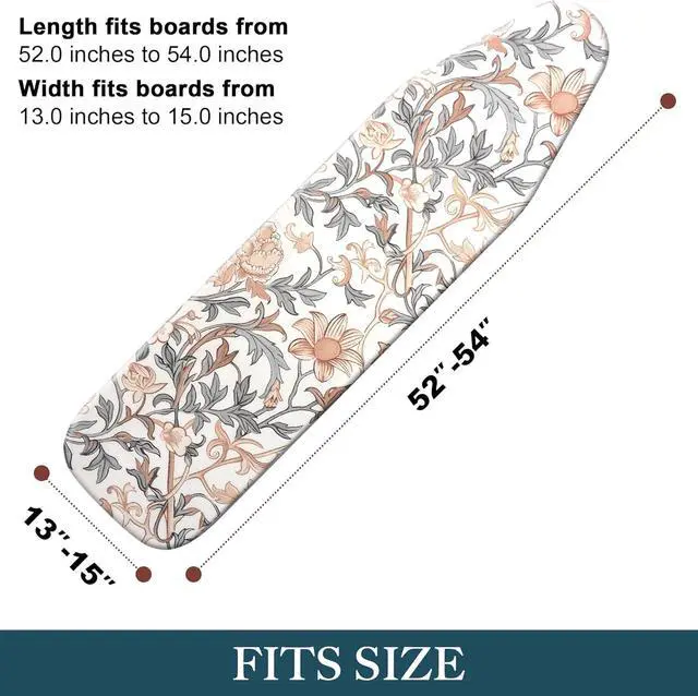 Ironing board cover size is 15X54 inches, It is suitable for standard-sized ironing boards with widths ranging from 13 inches to 15 inches and lengths ranging from 52 inches to 54 inches.