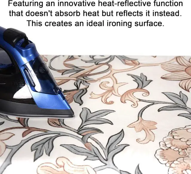 Ironing board cover featuring an innovative heat-reflective function that doesn' t absorb heat but reflects it instead. This creates an ideal ironing surface, allowing the iron to glide smoothly over garments and enabling you to iron both sides simultaneously. Reducing ironing time significantly.