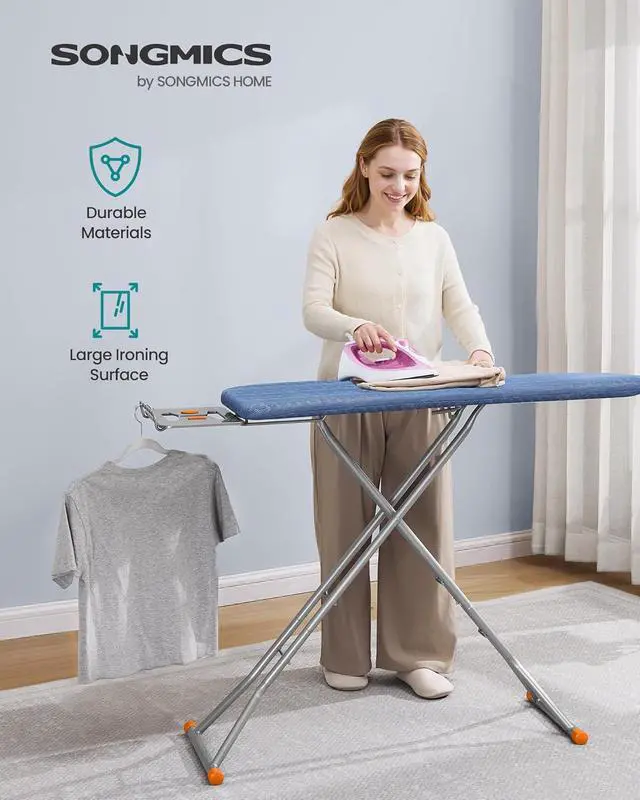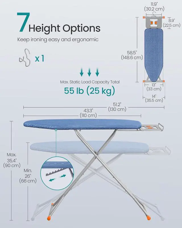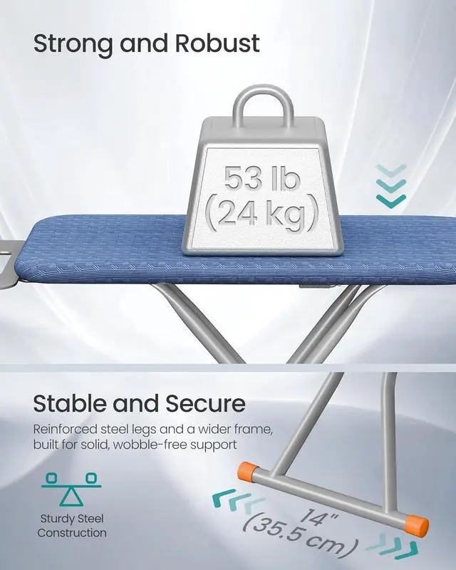 Stable and Built to Endure: Supported by robust steel X-legs with non-slip pads, this ironing board stays steady during use and holds up to 53 lb, while the iron rest supports 6.6 lb irons and 2.2 lb shirts