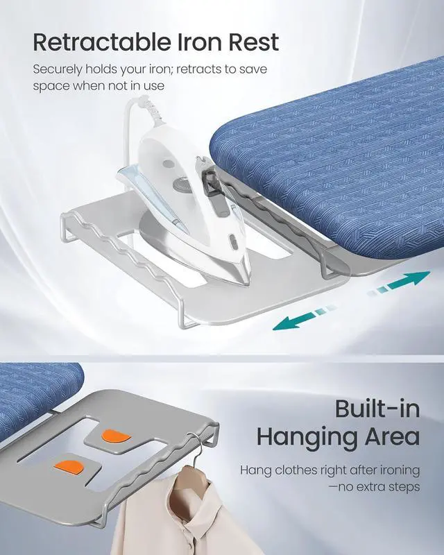 Innovative Space-Saving Design: This ironing board features a retractable iron rest that saves space and doubles as a hanging area, letting you iron and hang clothes in one spot for efficient ironing