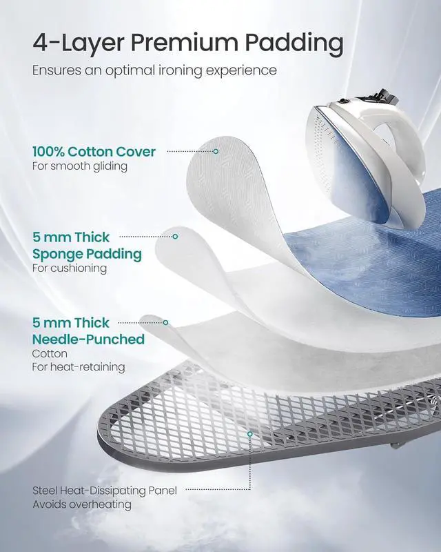 4-Layer Surface for Smoother Ironing: With a cotton cover, sponge padding, needle-punched cotton, and a warp-resistant steel panel, this iron board offers a fabric-safe area for improved ironing performance