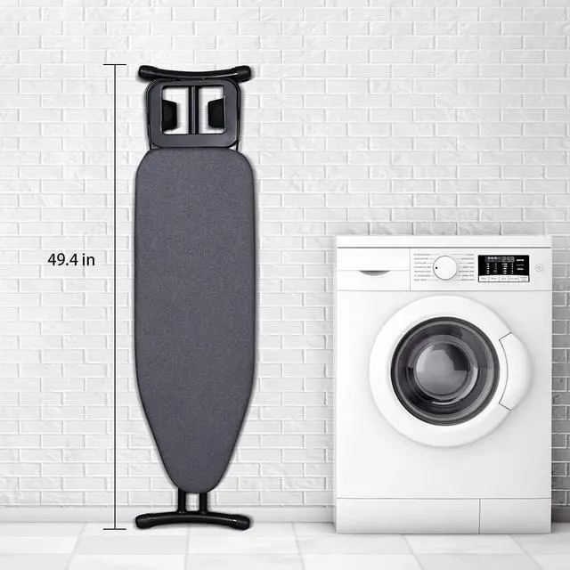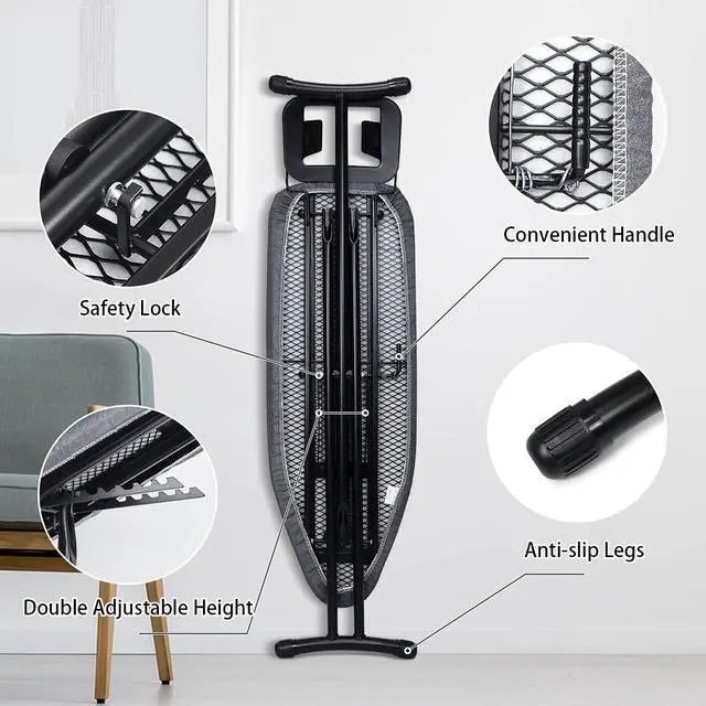 Heavy Sturdy Ironing Boards: 30 mm wide not-slip legs and children safety lock, make sure the whole structure strong and stable. Whole metal frame with classic black powder coating finish, looks new and last longer time