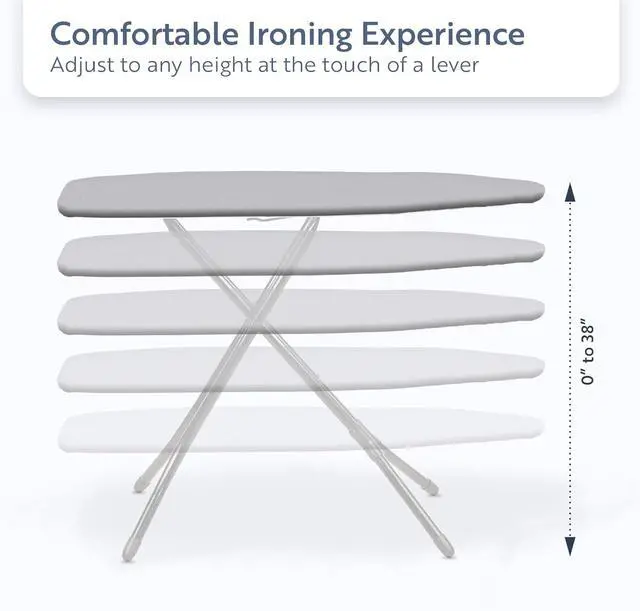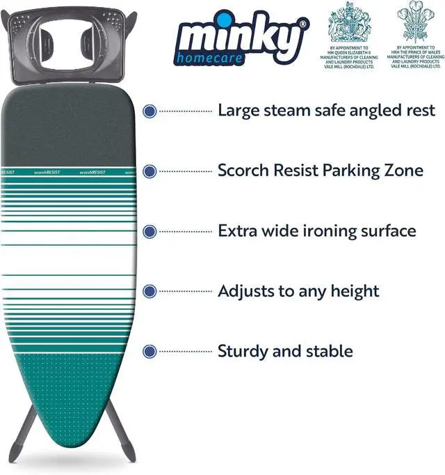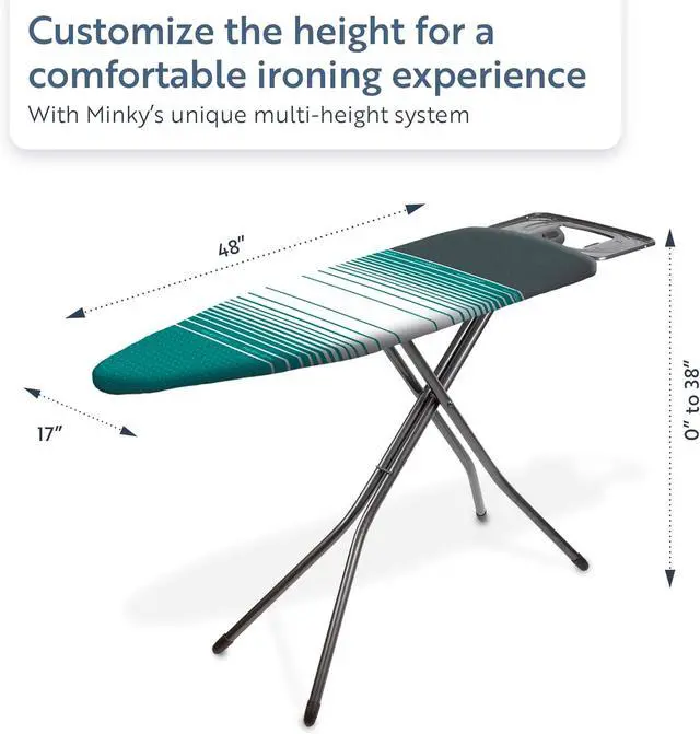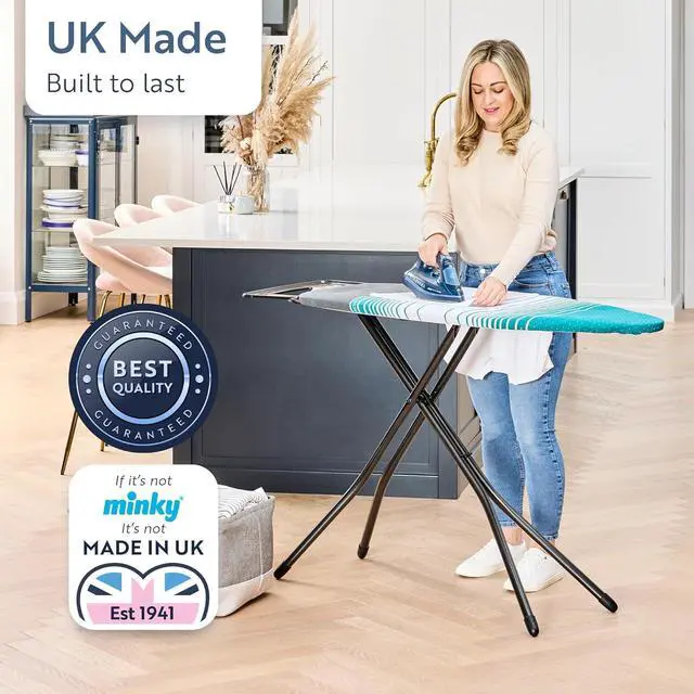 Fully height adjustable up to 38. Ironing surface measures 48 x 17. 5 Year Manufacturers Warranty. Made in the UK