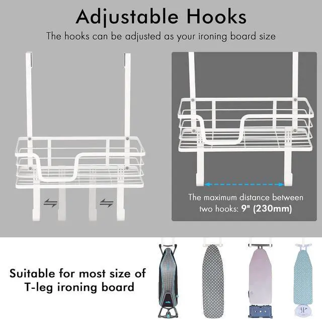Fit Most T-leg Ironing Boards: KES ironing board hanger has two bottom hooks that can be adjusted to hang different-width T-leg ironing boards. It can also be fixed to keep the iron board stable.