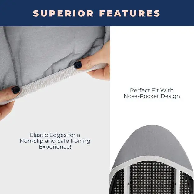 NOSE POCKET AND ELASTIC EDGES PROVIDE PERFECT NON-SLIP FIT - 1, 5 inches Elasticized edges and nose pocket design fits the board perfectly. Slipping and the exposure of the edges will be prevented by this. Providing you to have wrinkle free clothes in a shorter time. This ironing board cover and pad is designed for standard size boards (15x54 inches).
