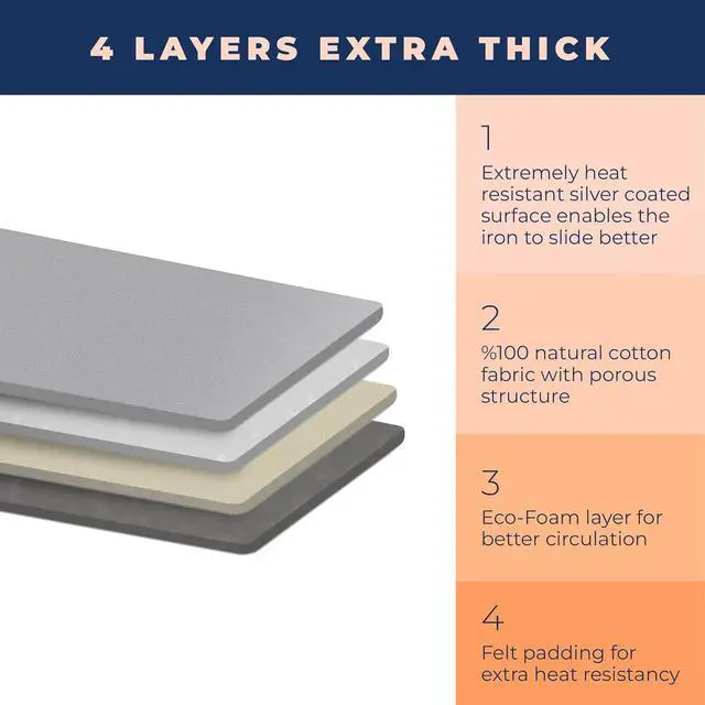 4 LAYERS EXTRA THICK PADDING FOR REMARKABLE DURABILITY - 4 layers heavy duty padding provides exceptional durability to ironing board cover and pad. Top layer (1st) is extremely scorch and stain resistant cotton fabric. Felt padding (2nd) provides extra heat resistant structure. Eco foam (3rd) provides better steam circulation. Durable and thick felt lining (4th) will maintain a flat shape during ironing.