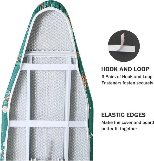 3. EASY TO INSTALLThe Elastic Edge of the Ironing Cover is Easily Placed on the Ironing Board, 3 Pairs of Hook and Loop Fasteners are Fixedly Connected, Making the Installation more Convenient and Quick.