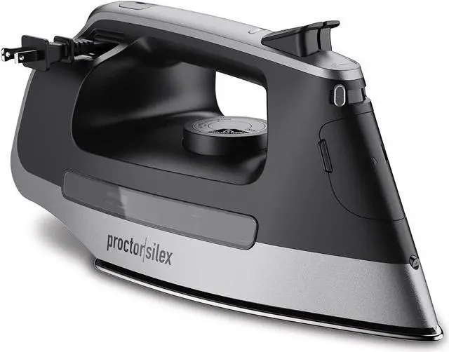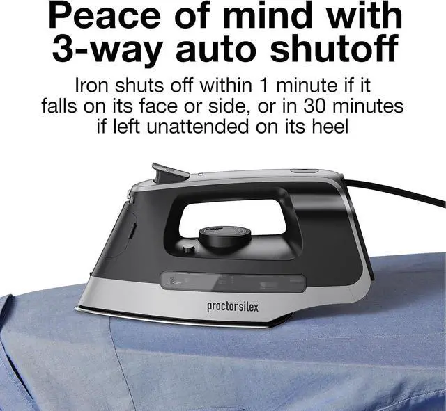 PEACE OF MIND WITH 3-WAY AUTO SHUTOFF. The Proctor Silex clothes iron shuts off within 1 minute if it falls on its face or side, or in 30 minutes if left unattended on its heel. It' s motion-sensitive, so you can quickly turn the iron back on by moving it.