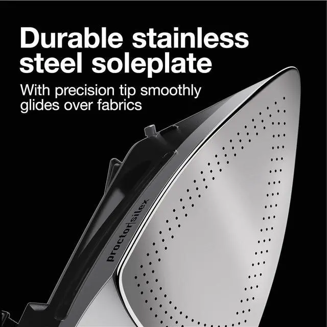 DURABLE STAINLESS STEEL SOLEPLATE SMOOTHLY GLIDES OVER FABRICS. This steam iron for clothes has a durable stainless steel soleplate that moves easily over fabrics, while the precision tip accesses small or hard-to-reach areas.