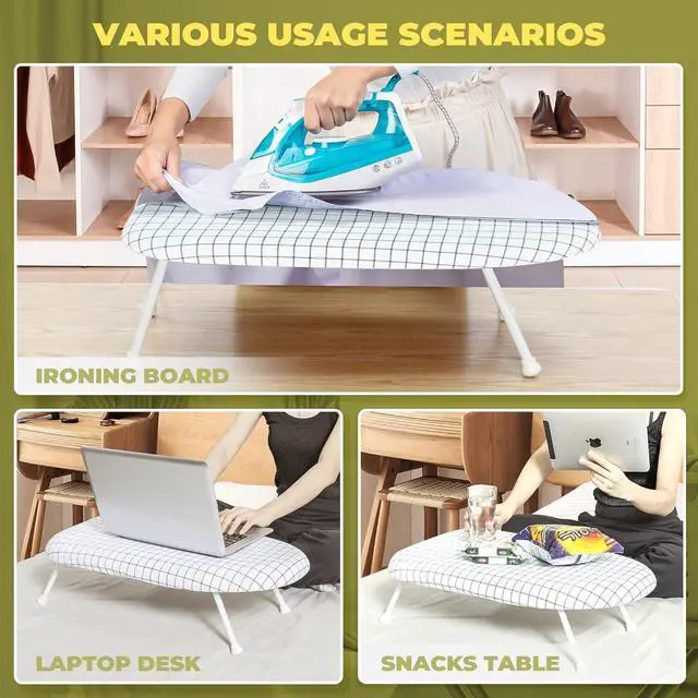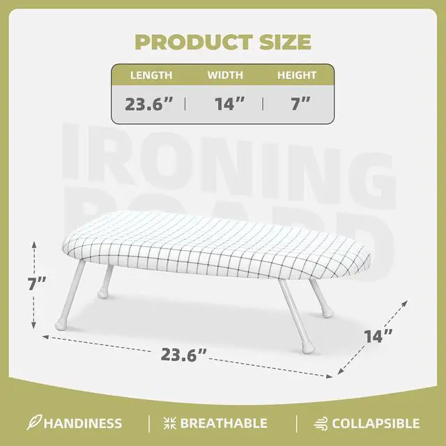 [Detachable & Washable Cover] Crafted from 100% cotton and featuring a thick felt pad, our mini ironing board boasts a resilient and spacious ironing surface that' s simple to maintain. The removable and washable cover adds extra convenience, ensuring easy upkeep.