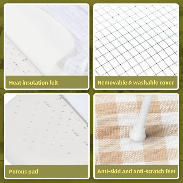 [Sturdy Steel Legs & Cooling Porous Pad] Designed with reinforced steel folding legs, our portable ironing board ensures stability, while non-slip feet caps provide countertop protection. The cooling porous pad offers excellent vapor permeability and heat dissipation, creating an ideal ironing surface.