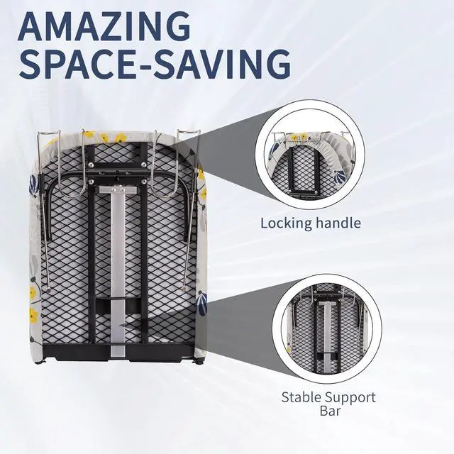 CONVENIENT FEATURES: Built-in iron rest and locking handle mechanism ensure safe, stable ironing surface with floral pattern cover